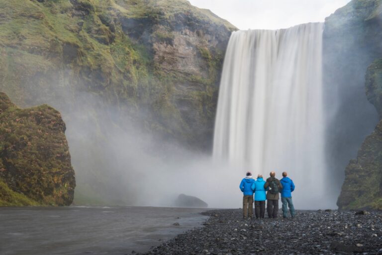 This morning, we leave Reykjavik behind and journey along Iceland’s dramatic South Coast, where waterfalls tumble from towering cliffs and glaciers crown distant peaks. Our first stop is Seljalandsfoss, one of Iceland’s most iconic falls. Here, we’ll step behind the curtain of water for a perspective few travellers experience – mist on our faces, laughter in the air, and the thrill of standing together in nature’s raw power.