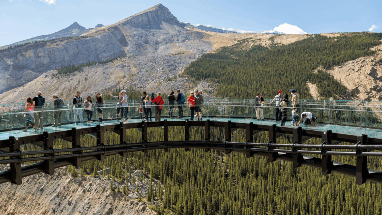 Arrive at the epic Columbia Icefields, home to one of the largest ice masses in North America. Step onto the 10,000-year-old Athabasca Glacier aboard an all-terrain Ice Explorer, where you’ll walk on ancient ice. Then, test your nerve on the glass-floored Columbia Icefield Skywalk, suspended high above the Sunwapta Valley.